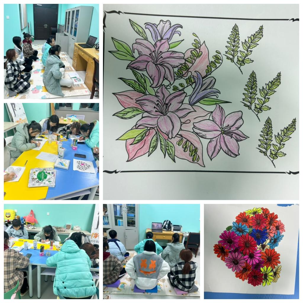 活动在一段轻柔的音乐中开始,参与者在组织者的带领下,开始了一段冥想之旅。随着呼吸的调整和意识的集中,大家逐渐进入了一种宁静而专注的状态,身心得到了放松。随后,参与者们拿起画笔,在画纸上自由地表达自己的内心世界。在画作中,花卉图案以柔和色彩与流畅线条展现了对自然美的感悟与内心的平和,水果篮凭借鲜艳的色彩和鲜明的对比体现了对生活细节的观察,蝴蝶则通过复杂的图案和强烈的色彩对比象征着对变化、对自由的渴望以及个性与内心世界的表达,每一幅作品都是对“心窗”的独特诠释。参与者们纷纷表示,通过这次活动,学会了如何在忙碌的学习和生活中找到片刻的宁静,以及如何通过艺术来表达和理解自己的情感。