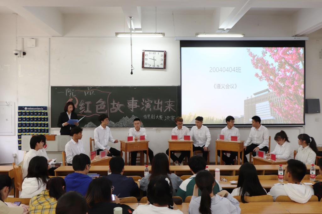 在观众热烈的掌声中,比赛开始。参赛班级围绕着“红色故事”这一主题展开,所表演的的内容各具特色。20040404班所表演的《遵义会议》,体现了遵义会议作为中国共产党生死攸关的转折点的重要性;19040S01和19040143班以“五四运动”为主题排演的节目《恰同学少年》,再现当年学生群体誓死保卫国家主权、反抗帝国主义压迫的情景;19040241班则向大家展现了标志中国共产党成立的会议——中共一大,向我们呈现出革命年代,特务的步步紧逼和革命先辈们的英勇无畏。演员们生动形象地演绎红色故事,将红色精神传递给了在场的每一位观众。最后,大赛在杨航同学的歌声中落下帷幕。通过各评委的评分,19040141班获得一等奖,20040341班获得二等奖,19040241班获得三等奖。