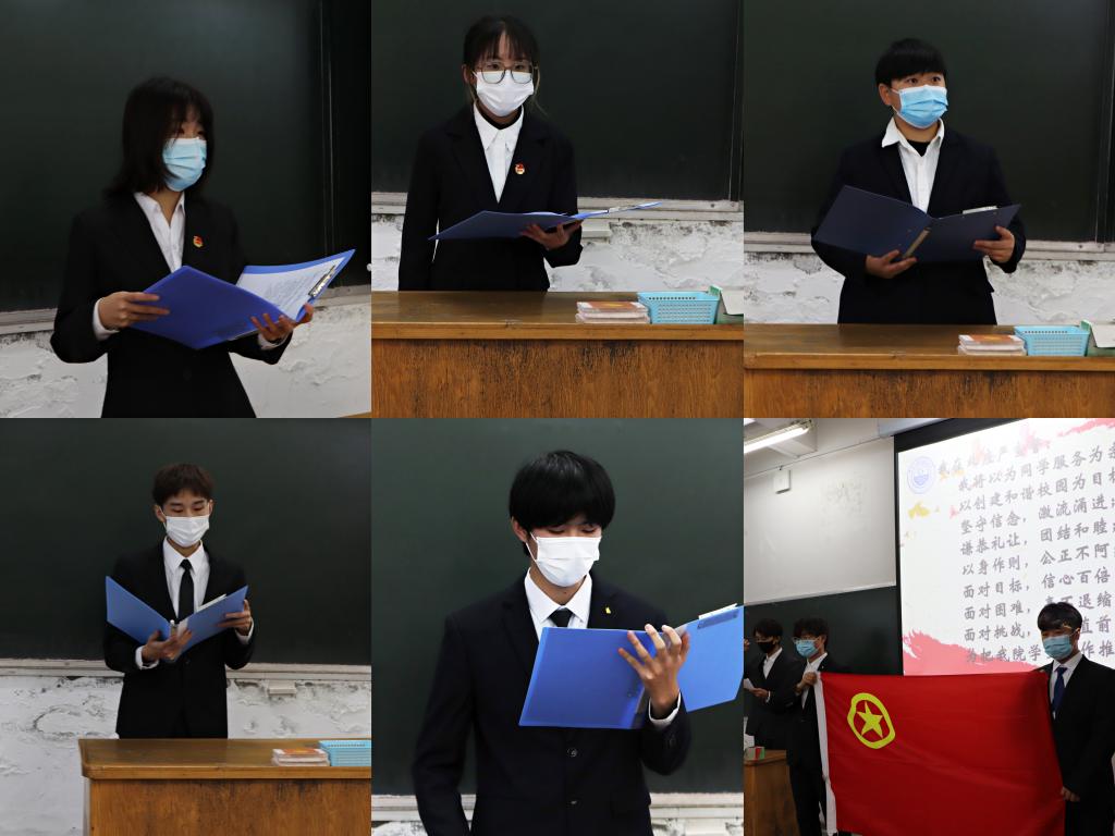 会上,院团委副书记及学生会主席团成员,进行了2021-2022年各学生组织工作计划的汇报。团委副书记钟秋怡同学条理清晰地向大家说明团委的总体工作规划,表示会在今后的一年里不断完善制度体系建设,全面贯彻党的教育方针,营造良好的学习氛围。团委副书记邱治慧同学的发言围绕职位心得和工作心得两方面展开,她强调学生组织应明确自己的职责,帮助老师做好金沙 团学工作,在继承中求创新,争创“五四”红旗团委。学生会执行主席欧白杨同学在工作计划中指出,新的一年里应深入落实学生会改革要求,推动作风转变,做好主题思想教育。分科协主席孟志鹏同学则表示,为激发学生们创新意识,提升实践能力,分科协会开展多项工作计划,让同学们在良性竞争中不断成长。学生服务中心主任姜帅同学提出学生服务中心的宗旨——同学服务,力求以坚持和落实为主,帮助同学们解决学习和生活中的各种问题汇报结束,全体学生骨干在蒋亚宏同学的带领下宣读誓词。