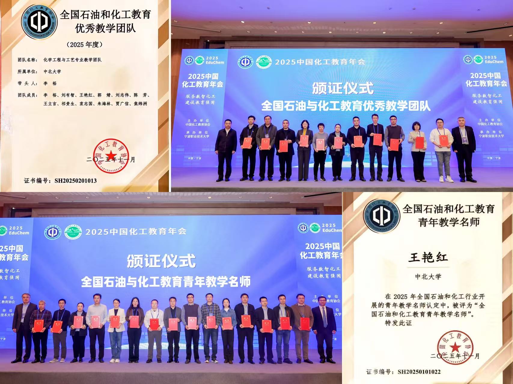 王艳红副教授“全国石油和化工教育青年教学名师”荣誉称号,授予李裕教授牵头的化学工程与工艺专业教学团队“全国石油和化工教育优秀教学团队”荣誉称号。本年度山西高校中只有以上两项荣誉获得认定。此前,金沙