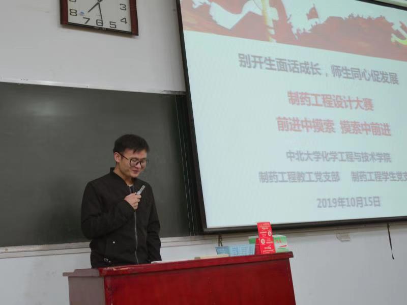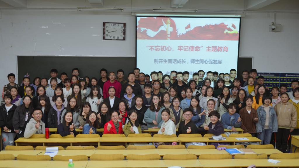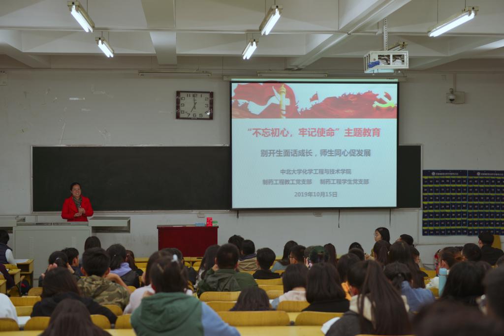 的安排部署,紧扣“守初心、担使命,找差距、抓落实”总体要求,把主题教育同落实“立德树人”的根本宗旨,激发广大党员解放思想、担当作为相结合,努力实现理论学习有收获、思想政治受洗礼、干事创业敢担当、教书育人见成效的目标积极开展了形式多样的主题党日活动。2019年10月15日晚,制药工程教工党支部联合制药工程学生党支部于在10101H教室举行了 “别开生面话成长,师生同心促发展” 主题党日活动,会议由制药工程教工党支部书记弓亚琼主持,支部全体党员以及100多名学生共同参加本次活动。