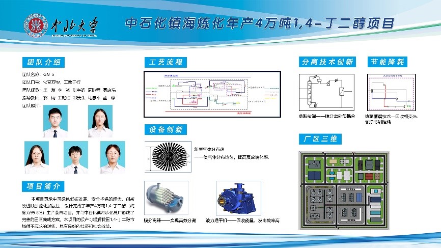 师生们刻苦训练、反复研讨,在工艺路线、分离技术和过程节能和设备设计、资源利用、环保、安全、经济等进行多方面创新设计,使用多种现代设计方法设计了一座充分反映新时代化工设计理念的1,4-丁二醇生产装置项目。该竞赛有助于培养学生创新思维、工程技能和团队协作精神,且在增强大学生的工程设计与实践能力,实践“卓越工程师教育培养计划”等方面起到了重要作用。