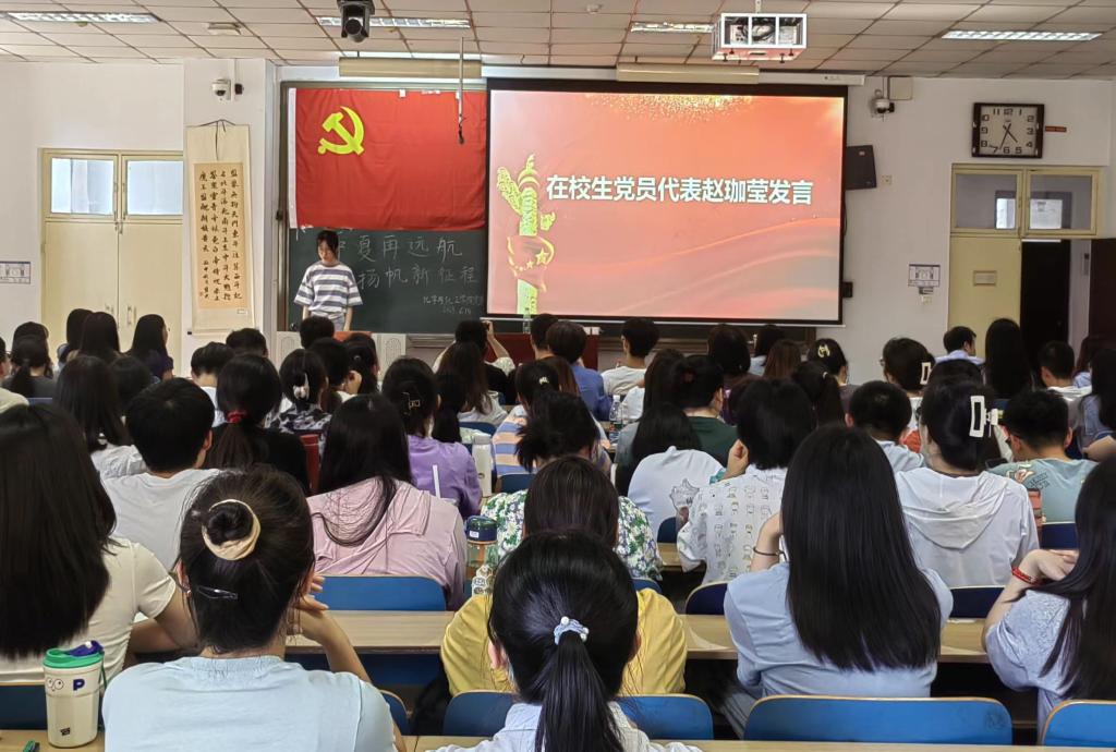 在校生党员代表赵珈莹为毕业生党员送上祝福,并且向学长学姐们承诺他们会牢记嘱托,勇毅前行,做新征程的主力军,做新时代的追梦人。