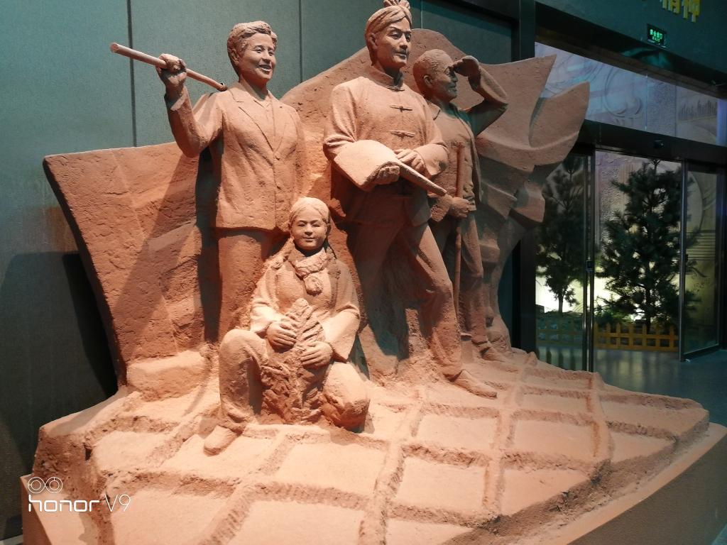 在解说员的带领下,实践队员们走进了正管,映入眼帘的是是两幅浮雕,高五米,宽二十米,分别讲述着陕西省北治沙、南治土的艰辛历程,看着浮雕一处处精美的细节,从左向右由沙漠到绿洲,榆林人民首创飞机播种,引领世界治沙走向前沿。在主题厅内队员们看到了墙壁上引人注目的榆林治沙精神:不畏艰难,勇于拼搏,矢志不渝,开拓创新。解说员说:当年的老榆林由于沙漠向南蔓延导致三次南迁,在上世纪还能排到老榆林城墙被风沙掩埋不足一米高。历经六十载风沙漫天,榆林人将毛乌素沙漠几乎消灭,堪称世界奇迹。