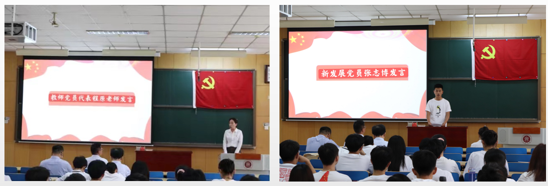教师党员代表程原,学生党员代表尚文涛,新发展党员代表张志博先后发言,他们表示党员不仅是一个身份,更是一份责任,党员同志要时刻警醒自我、规范言行,积极履行党员职责,立足岗位做贡献,亮明身份做榜样,充分发挥好党员的先锋模范作用,让党徽在每名党员胸前,变成一道亮丽的“红色”风景线。